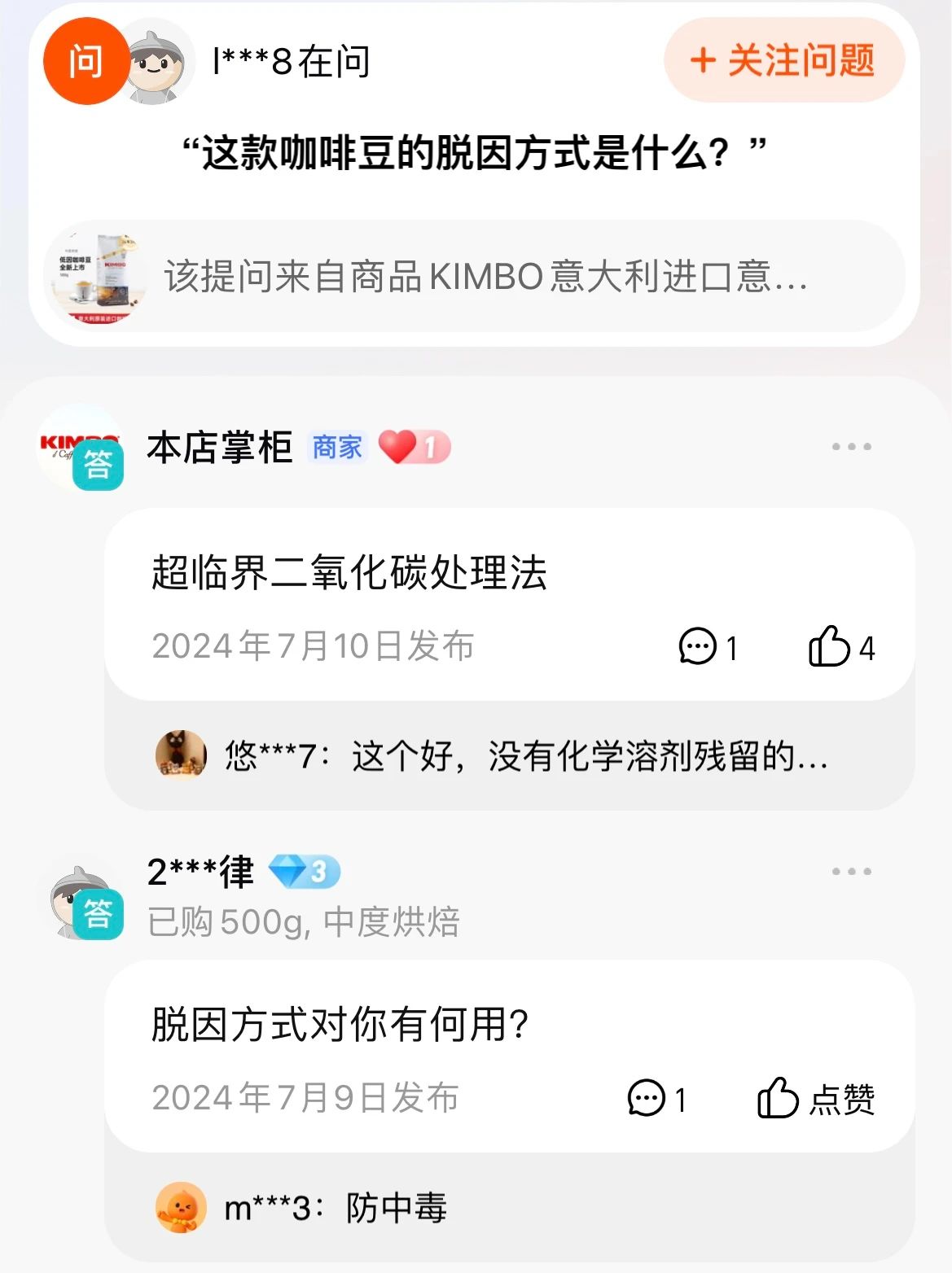 有消费者了解到这段故事,对采用化学溶剂处理的低因咖啡比较抗拒,在淘宝的商品提问区,消费者关心最多的问题就包括——影响睡眠吗?孕妇能喝吗?风味好吗?脱因方法是什么?