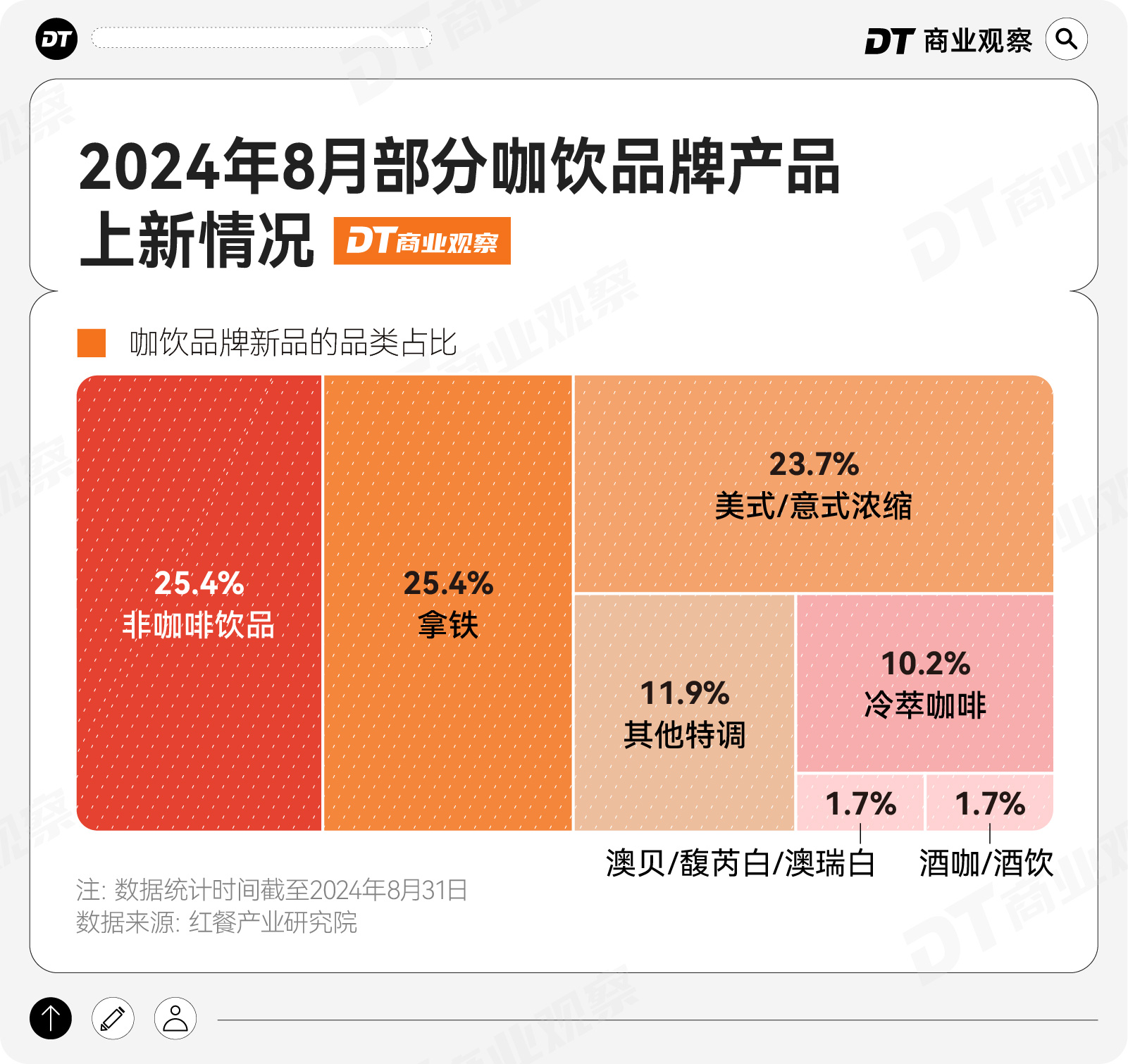 据红餐产业研究院,2024年8月,有17个连锁咖饮品牌共推出了59款新品,其中有15款非咖啡饮品,占咖饮新品总量的25.4%,排名第一。