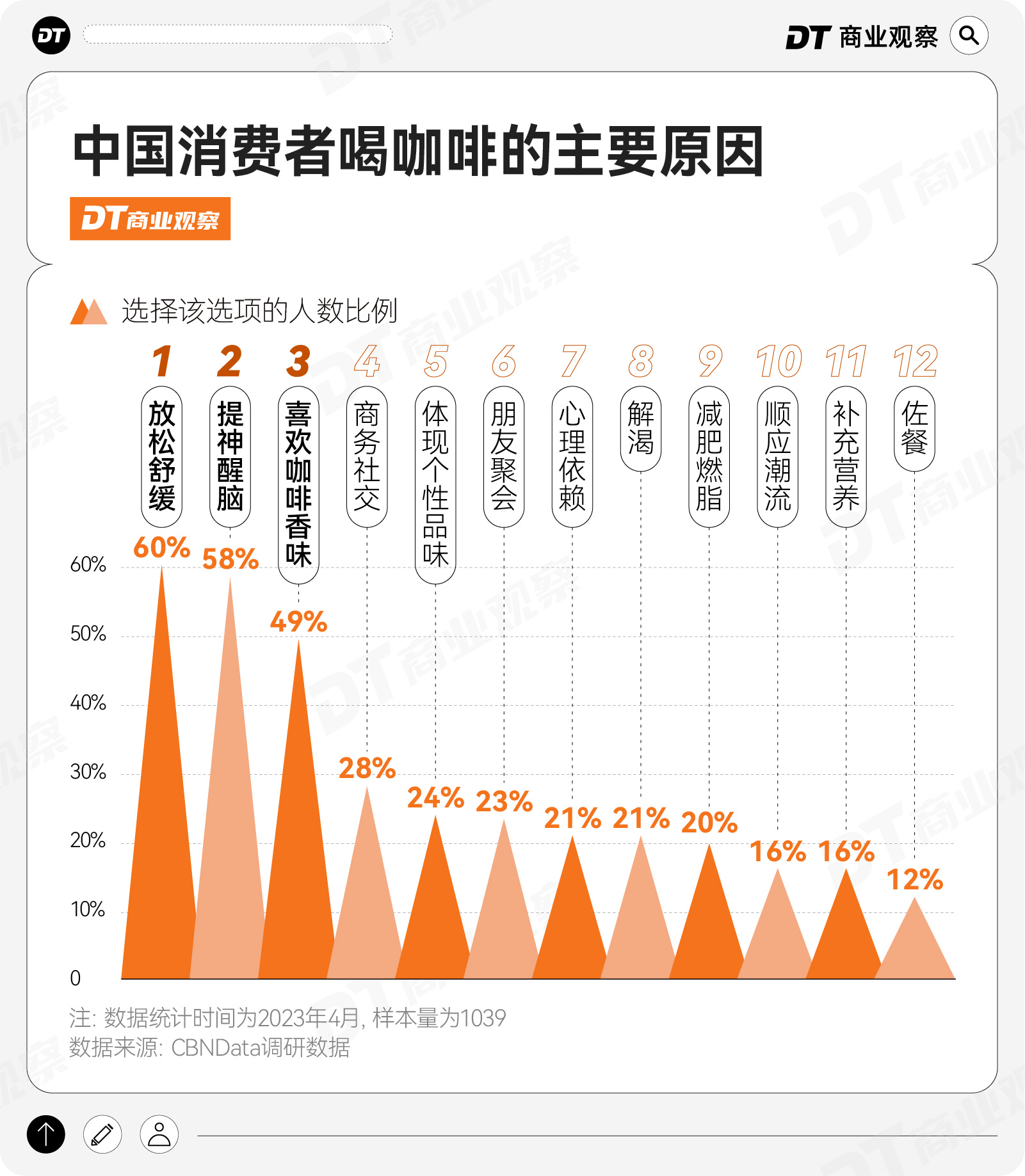 CBNData在2023年发布的调研数据显示,消费者喝咖啡的原因中, 58%的人是为了提神醒脑,除此之外,有60%的人通过喝咖啡来放松舒缓,还有49%的人是因为喜欢咖啡的香味。